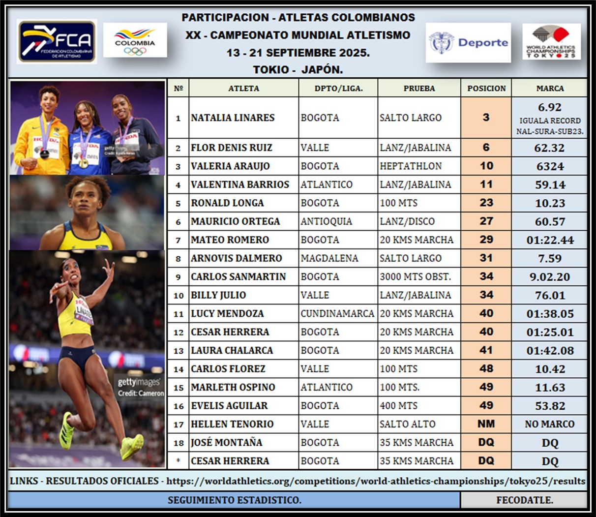 Por su parte, Natalia Linares comentó: “Decirles que somos medallistas de bronce, ahora pensamos en otra medalla, en otro campeonato. Estoy muy orgullosa de ser colombiana, hay una foto muy especial y es cuando recibo ese sombrero y esa bandera. Quiero decirles que como deportista no hay nada más especial que recibir los símbolos que nos representan, yo compito porque quiero ser la mejor del mundo, pero también para que el mundo nos conozca por nuestro talento”.