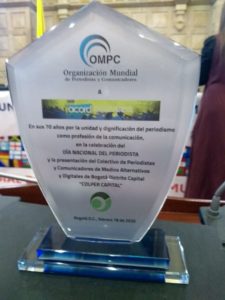 Organización Mundial de Periodistas y Comunicadores a ACORD en sus 70 años por la unidad y dignificación del periodismo como profesión de la comunicación, en la celebración del DÍA NACIONAL DEL PERIODISTA, y la presentación del Colectivo de Periodistas y Comunicadores de Medios Alternativos y digitales de Bogotá, Distrito Capital. Bogotá, febrero 18 de 2020.